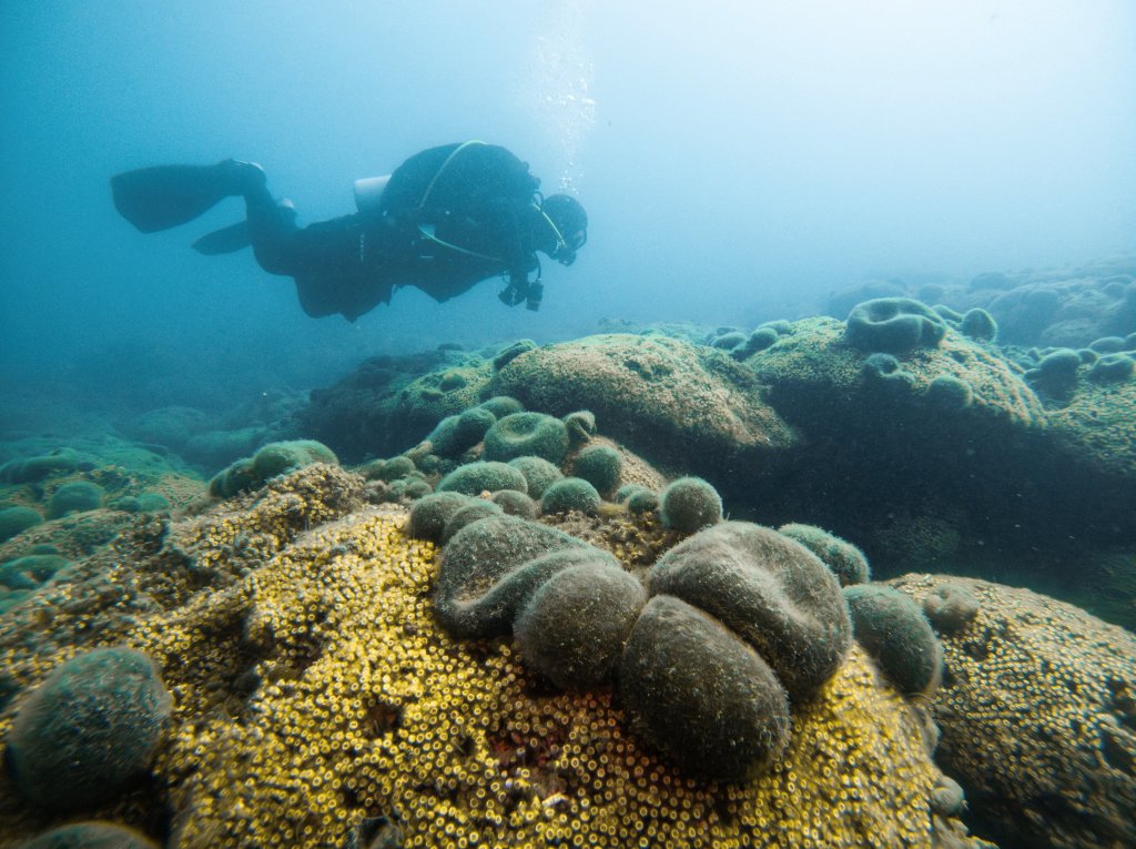 A diver inspects the coral reef Cladocora caespitosa in the Great Lake at Mljet National Park, Croatia